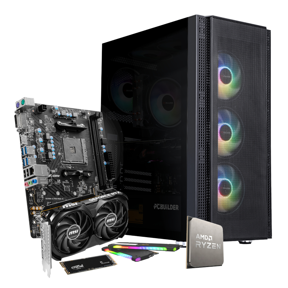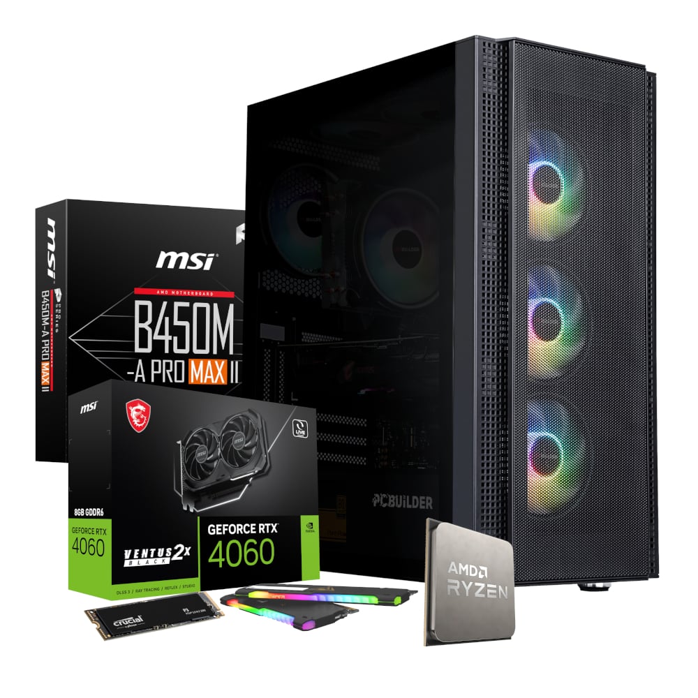 Outlast the opposition with the PCBuilder AMD Ryzen 5 5600X BARRICADE Windows 11 Gaming PC. This pre-built gaming PC is powered by a 5th generation AMD Ryzen 5 5600X CPU. It also comes with an MSI B450 chipset motherboard, 16GB of high-speed DDR4 memory, an MSI GeForce RTX 4060 Graphics Card, an NVMe SSD and a 600W Non-Modular power supply.