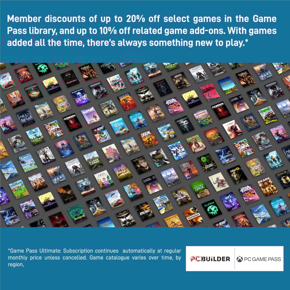 - Play over 100 high-quality PC games, plus new and upcoming blockbusters on day one like Halo Infinite, Forza Horizon 6 and Age of Empires IV with your new build and one month of Xbox Game Pass including EA Play. With new games being added all the time, there’s always something new to play.