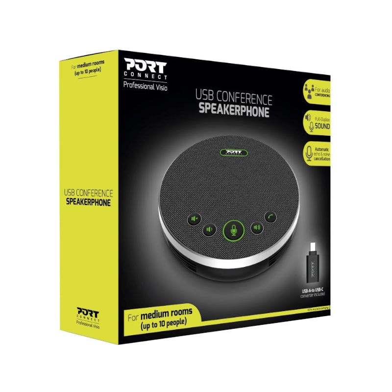 Say goodbye to distracting background noise and echo. Our Automatic Noise and Echo Cancellation technology keeps your conversations flowing smoothly, letting you focus on productive discussions. The Port USB Conference Speakerphone includes two omnidirectional built-in microphones, and catches sounds from every corner of the room, ensuring that everyone’s input is heard loud and clear. Furthermore, with its Plug & Play capabilities, setup is simple; no drivers are necessary.