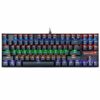 The Redragon K522 KUMARA RGB Mechanical Gaming Keyboard is not your average gaming keyboard. It features custom mechanical switches for a tactile feel when gaming, which in turn gives you the best performance. The KUMARA comes equipped with an adjustable RGB LED lighting system that shines brightly through its double-shot injection moulded keycaps. Its design is very sturdy and meant to withstand any gaming scenario thanks to its metal and ABS construction and gold-plated USB connector. Another main feature of the Redragon KUMARA is that it comes with 87 standard conflict-free keys with 12 multimedia keys as well as OUTEMU mechanical red switches and a splash-proof design.